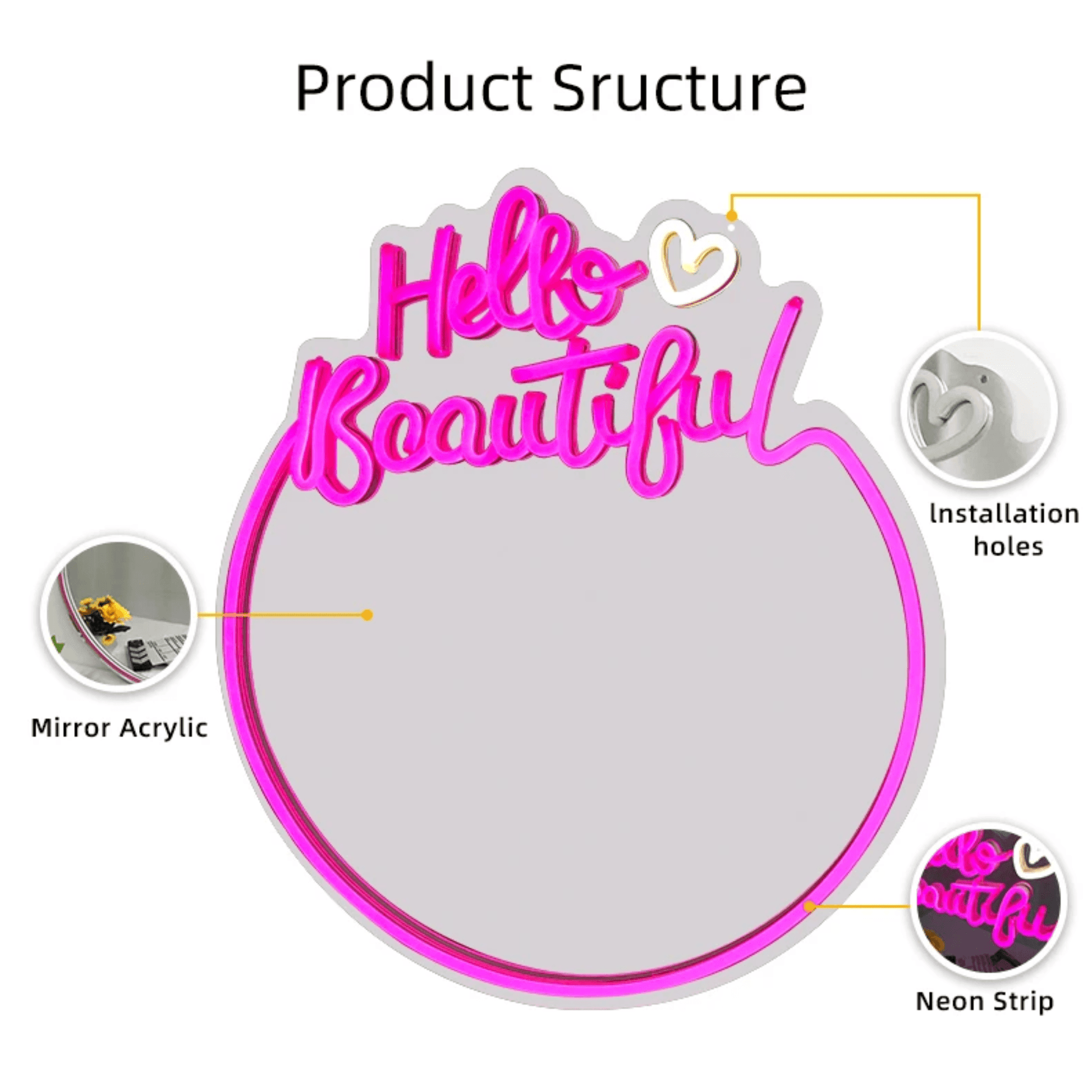 The sleek design and charming "Hello Beautiful" message make it a perfect addition to any bedroom, vanity area, or living space. Hang it on your wall to instantly elevate your decor and infuse your surroundings with a touch of glamour. Whether you're getting ready for the day or simply admiring your reflection, this neon wall mirror adds a delightful charm to any environment.