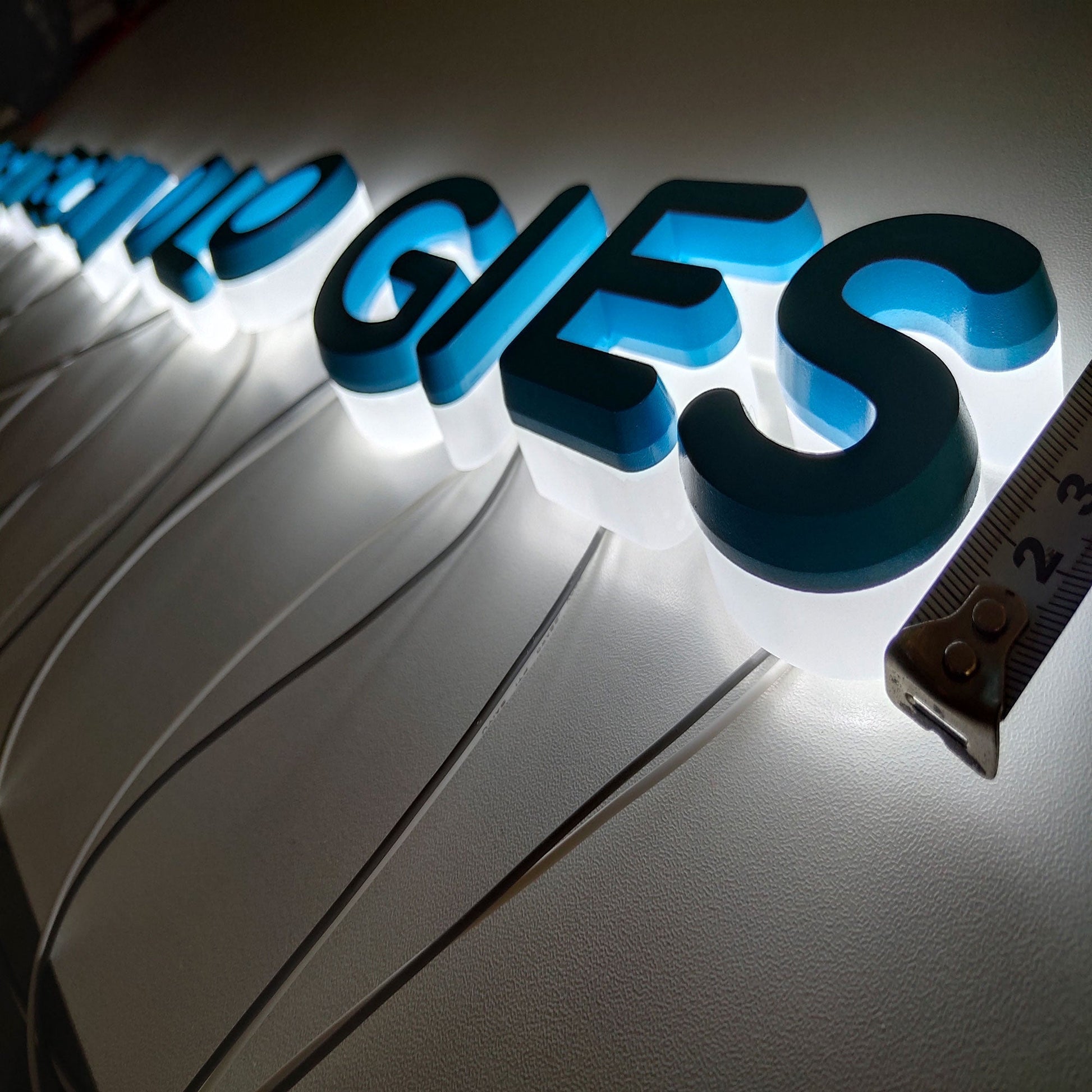 While backlighting is a great way to help your sign stand out from the wall, especially in poorly lit areas, only certain signs with large enough letters or bold font may apply for illumination. Illuminated letters or logos must allow enough space on the back to hide 1⁄2″ wide LED strips without running into difficulty.